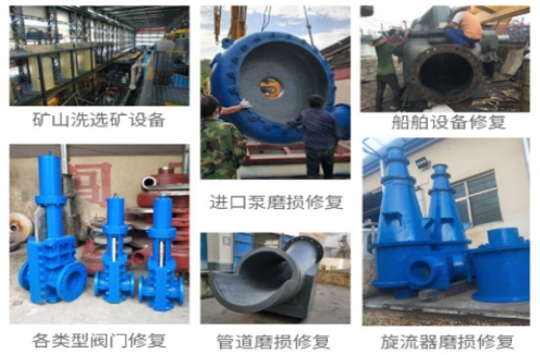 纳米聚合陶瓷耐磨涂层主要应用于:选矿设备过流冲蚀磨损修复,如:旋风分离器,浮选柱,浮选机,泡沫罐,分级机,搅拌罐等设备的预涂耐磨层,溜槽的维修,管道配件,渣浆泵和其他设备(典型用途请参见主要物理和机械性能表)。